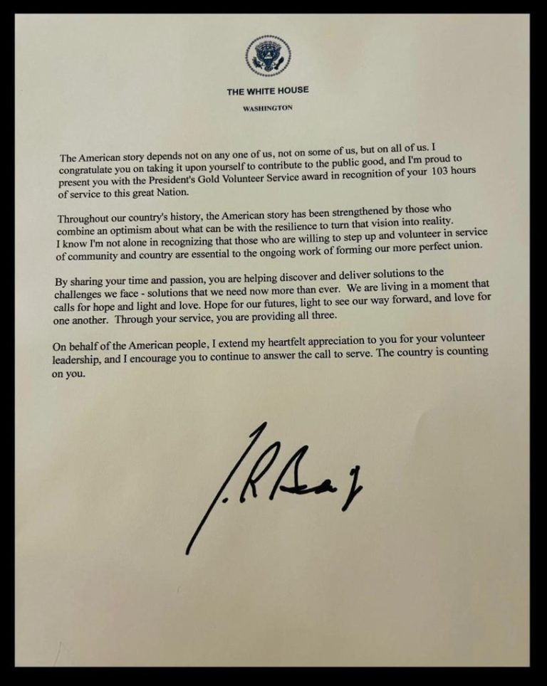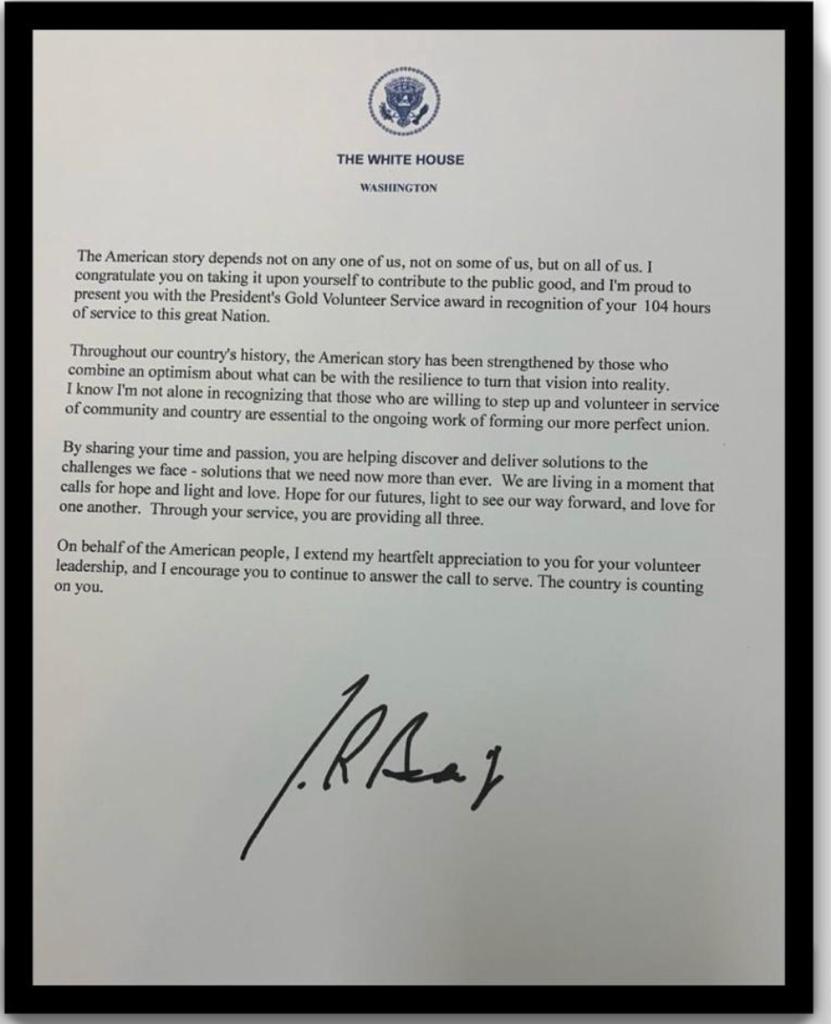 In 2003, President George W. Bush established the President’s Council on Service and Civic Participation (the Council) to recognize the valuable contributions volunteers make in communities and to encourage more people to serve. The Council created the President’s Volunteer Service Award program as a way to thank and honor individuals who, by their demonstrated commitment and example, inspire others to engage in volunteer service. It is awarded based on the number of hours volunteers have served during 12-month period or over the course of a lifetime. The awards are offered in various levels to recognize different milestones of service achievement. Levels include Bronze, Silver, Gold and Lifetime achievement.