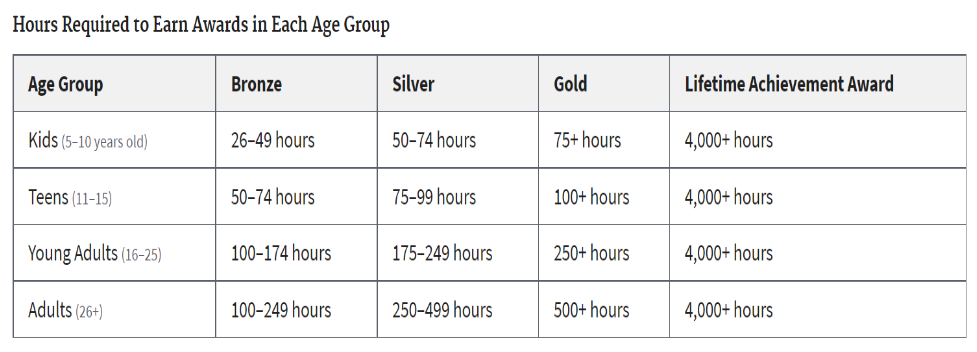 - Completes eligible service within a 12-month period (for annual Bronze, Silver, and Gold Awards) and over a lifetime (for Lifetime Achievement Awards)